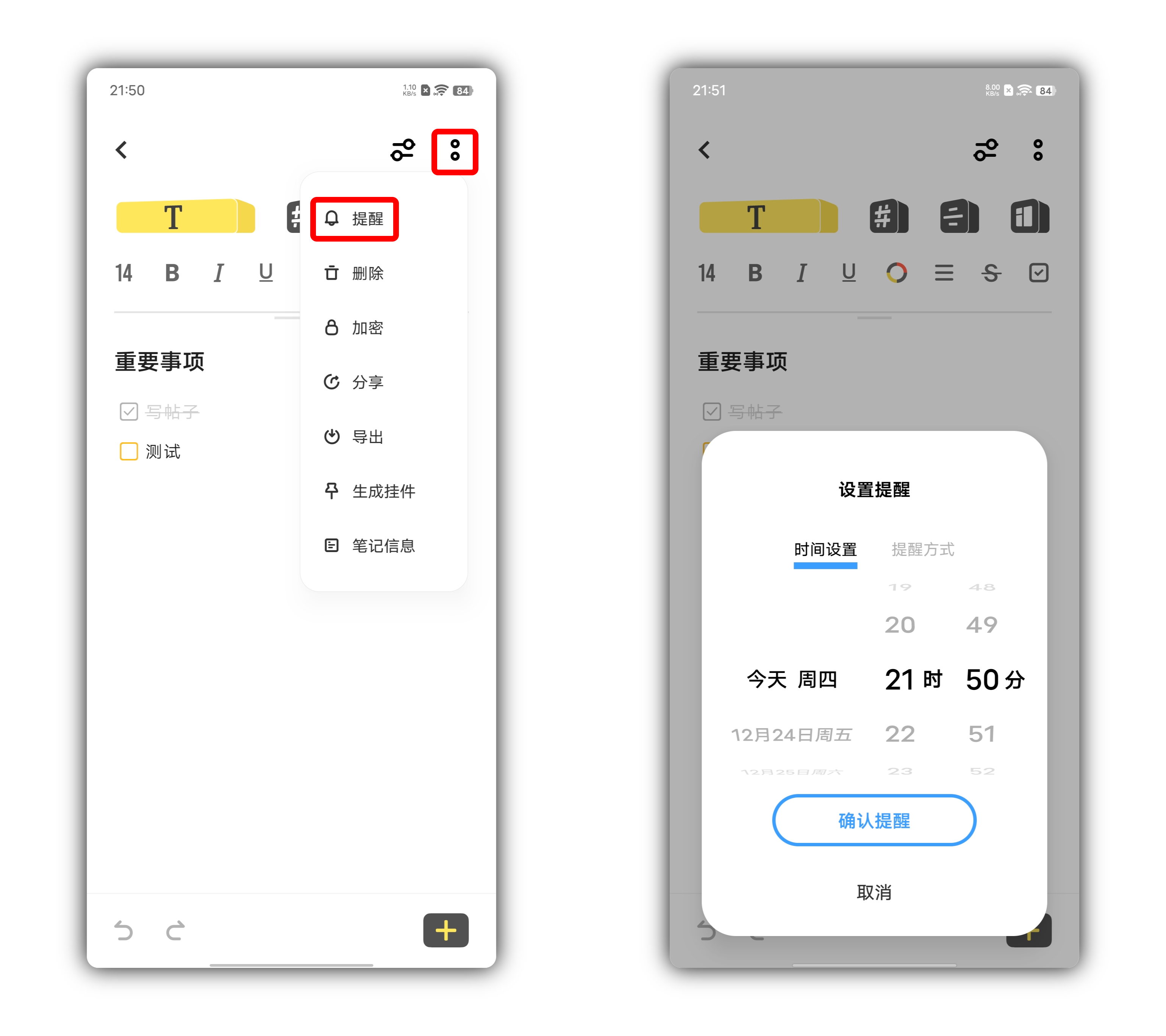 有必要的话,可以设定一个提醒时间。进入笔记,点击右上角的按钮,并点击提醒进行设置。