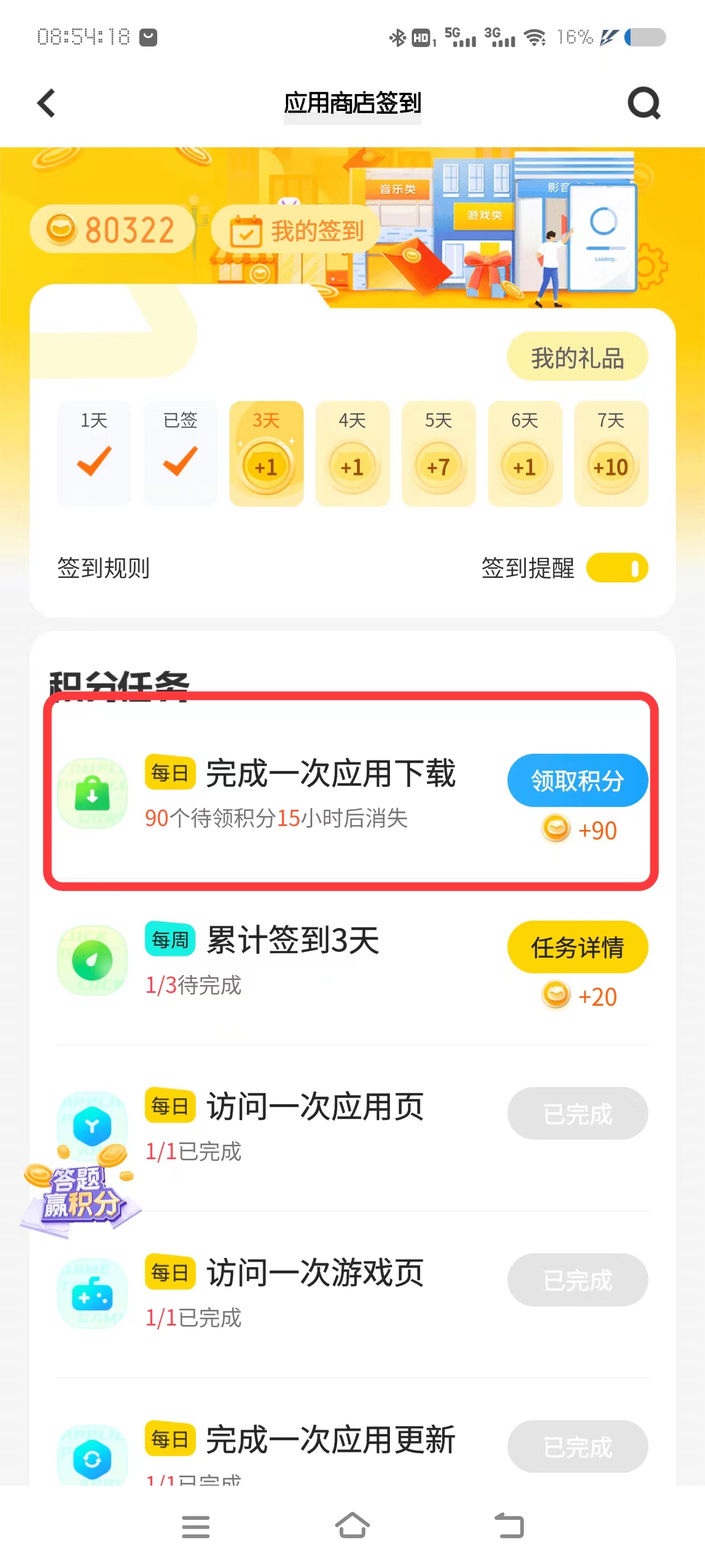 其中完成一次应用下载,可以完成10次,总计100积分,我之前领取一次,之后下载九次,总计100积分,不要忘记下载领取