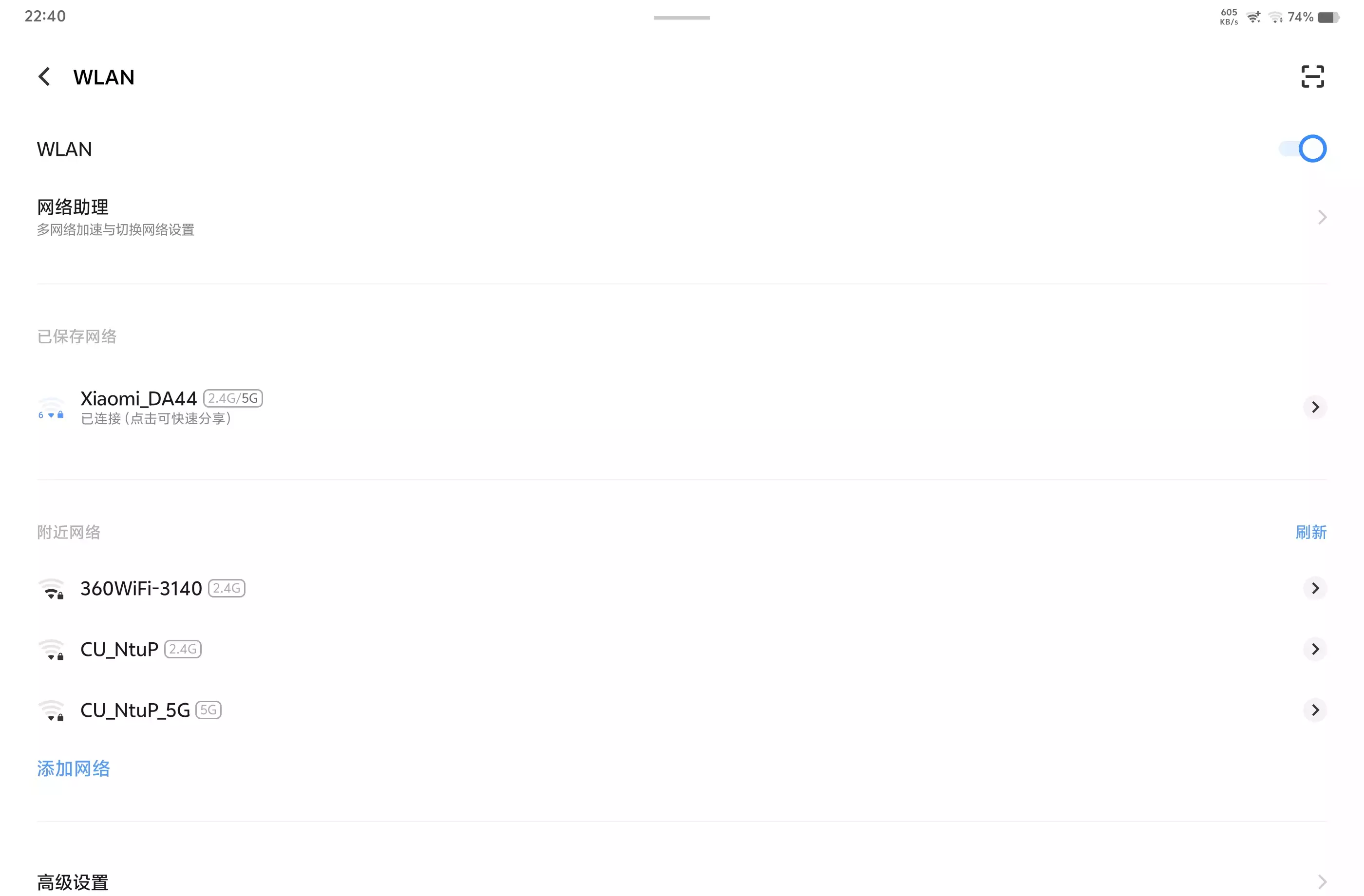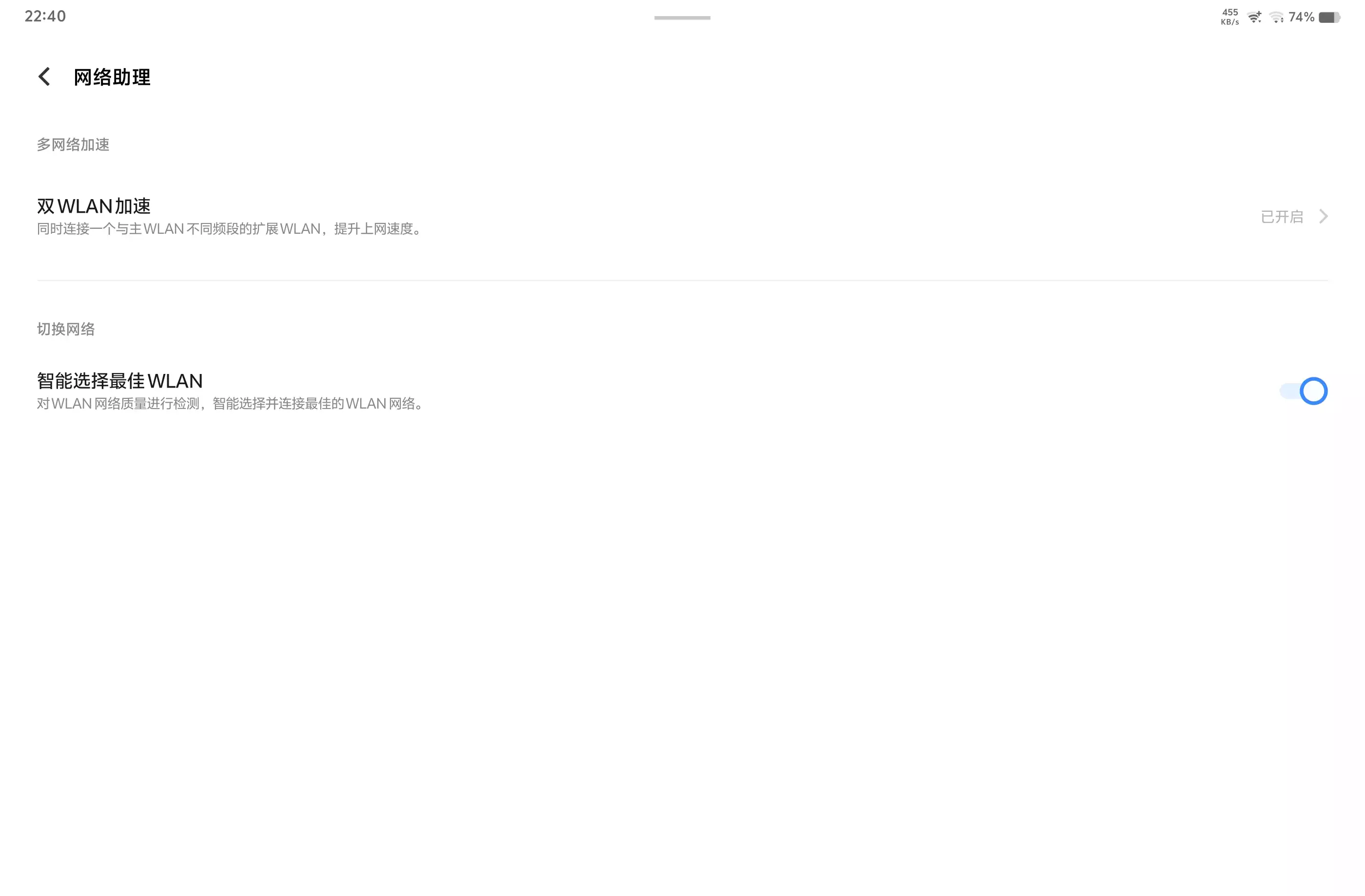 开启双WLAN加速后,wifi不会自动切换到2.4G 详细:无线网是双各一的,也就是2.4G和5G的合在一起,在网络旁边连接后,显示连接了俩,主的是5G,副的是2.4。远离热点后5G贼卡,2.4正常,但设备上主的还是5G,所以设备网卡。但如果关闭双WLAN加速后,就会自动切换了(靠近热点自动切换5G,远离切换2.4G,怎样都不会卡)
