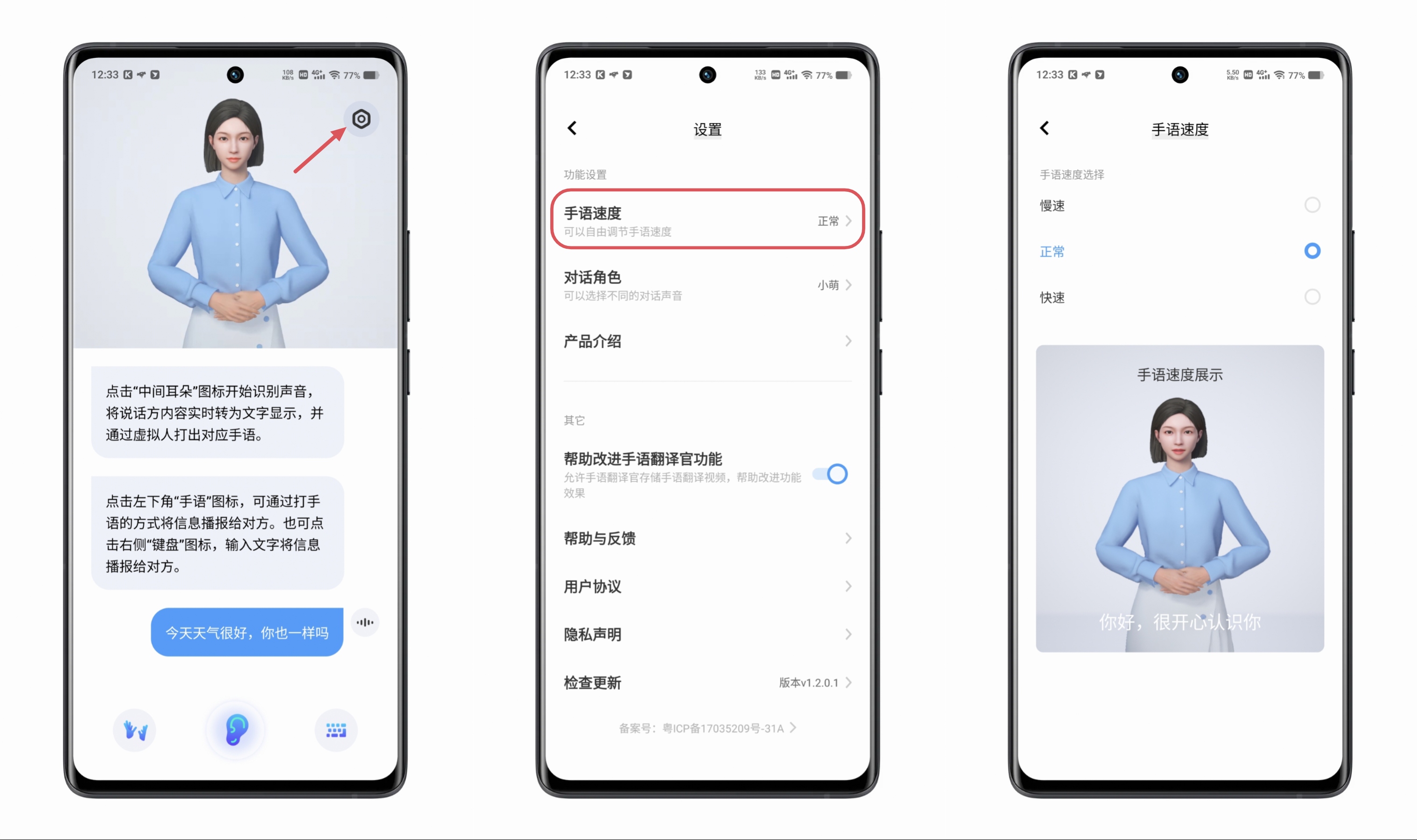 语音实时转换手语和文字之后,如果tā觉得手语速度过快或过慢,也可以对手语速度进行调节。