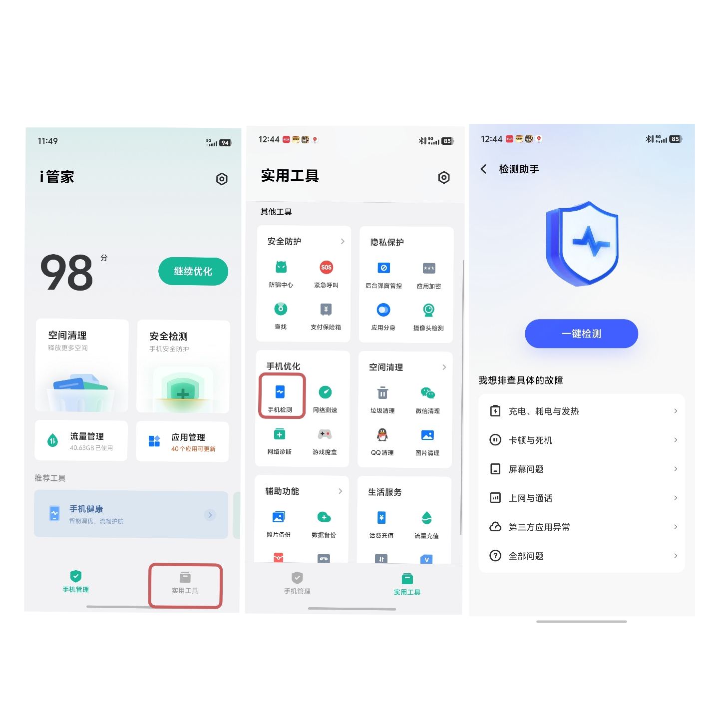 i管家中的手机检测功能可对手机硬件进行全面检测,能检测wifi、网络、蓝牙等是否正常。检测接近完成时,部分检测如麦克风和扬声器需手动辅助检测。